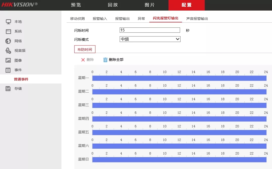 進入事件-普通事件-閃光報警燈輸出頁面,設(shè)置閃光燈閃爍時間和閃爍頻率(閃爍頻率太快時,即為常亮)。