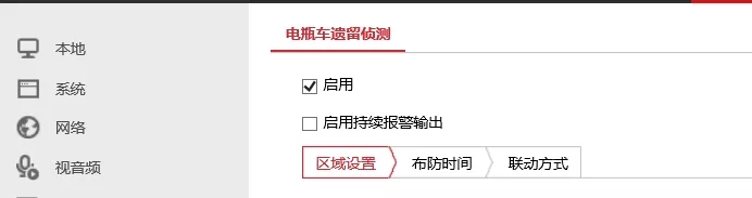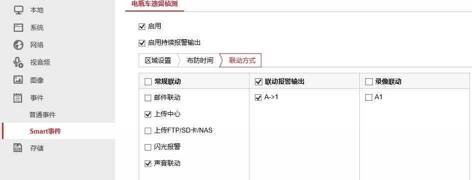 通過【事件】-【Smart事件】-【電瓶車遺留偵測】,勾選【啟用】和【開啟持續(xù)報警輸出】,繪制檢測區(qū)域。
