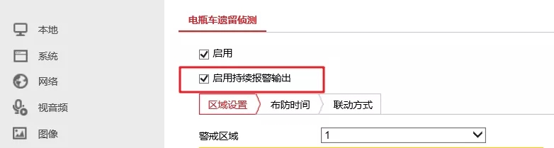 (1) 開啟持續(xù)報警輸出:只影響監(jiān)控ALARM端子的報警輸出,即:若算法持續(xù)檢測到電瓶車目標(biāo)在相應(yīng)區(qū)域,則報警持續(xù)的輸出;此時,報警輸出的延時時間建議配置為5S。