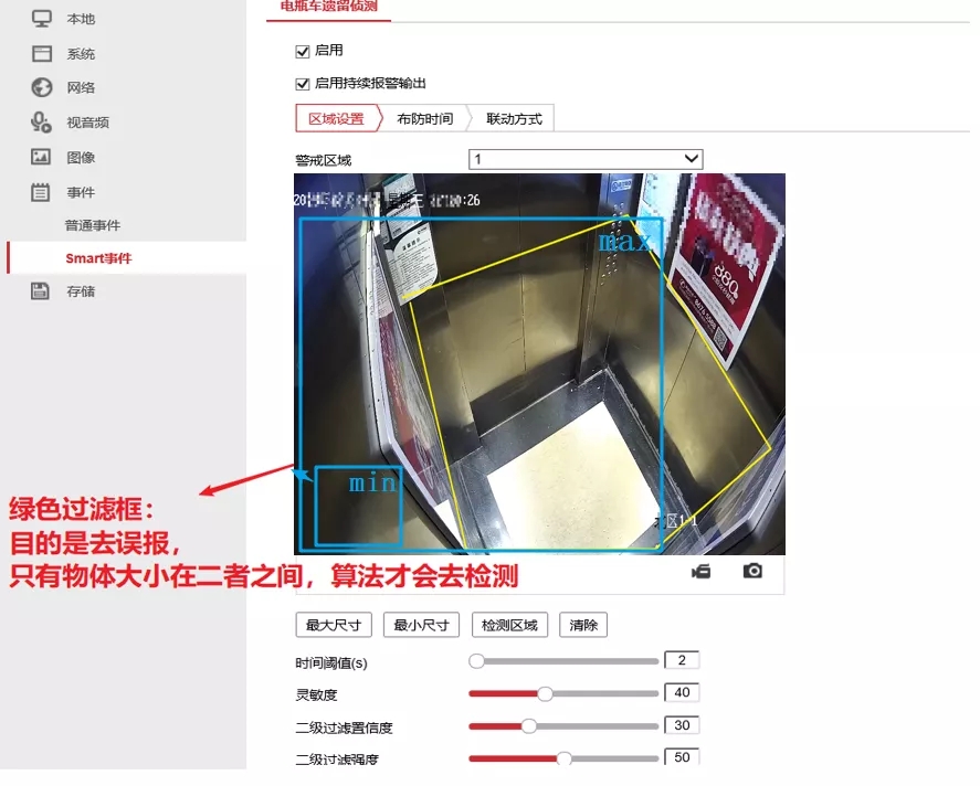 檢測區(qū)域繪制繪制完畢后,設(shè)置最大最小規(guī)則過濾框,只有目標(biāo)物體在兩個框尺寸之間的像素才會去檢測并報警。