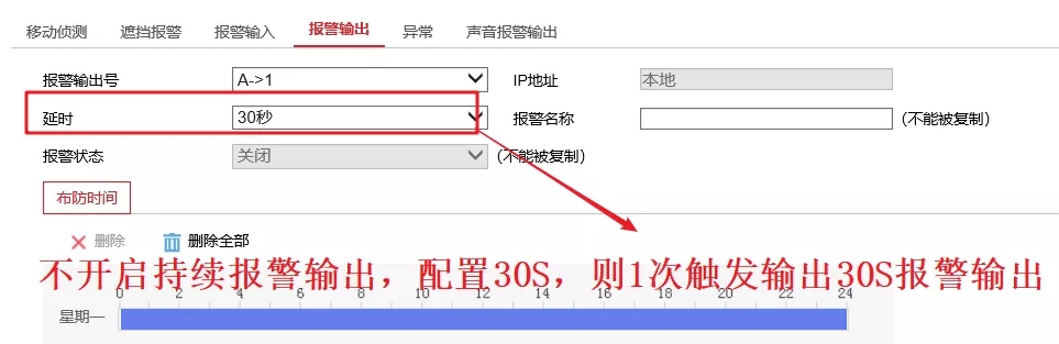 (2)在不啟用持續(xù)報警的前提下,則檢測到目標(biāo)后,按照延時時間配置進行報警輸出。如配置30S,則觸發(fā)一次語音報警輸出,報警輸出30S后消失。