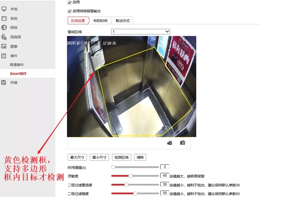 點擊【檢測區(qū)域】,繪制黃色的檢測框覆蓋電梯內(nèi)電瓶車檢測的區(qū)間范圍。為了不檢測到電梯墻壁上的物品影子、廣告牌、顯示屏滾動播放的內(nèi)容,可繪制多邊形規(guī)則區(qū)域,避開電梯內(nèi)的廣告牌和側(cè)面壁的投影。