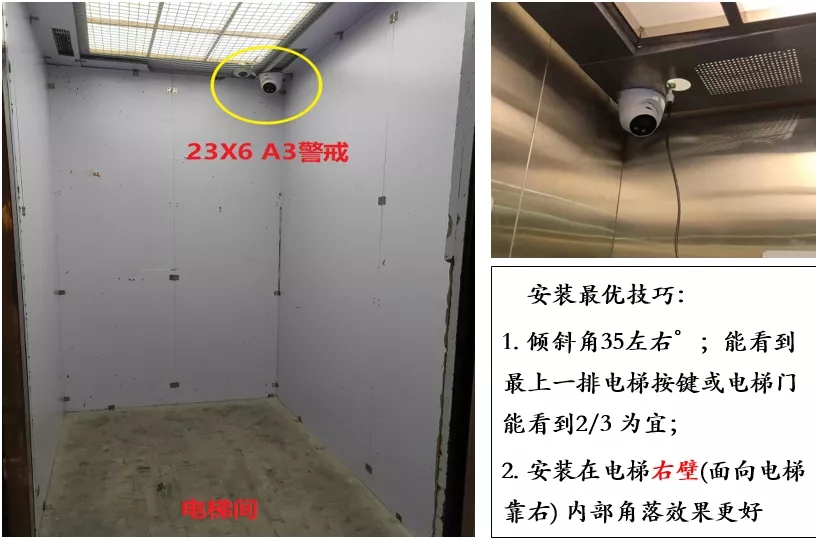 角度調(diào)整可參考如下經(jīng)驗:在電梯門口縫隙處站一個人,從監(jiān)控畫面看,能看到人眼睛的位置?;蛑庇^來看,攝像機視頻畫面能覆蓋右側(cè)電梯門上最頂部的按鍵為佳。